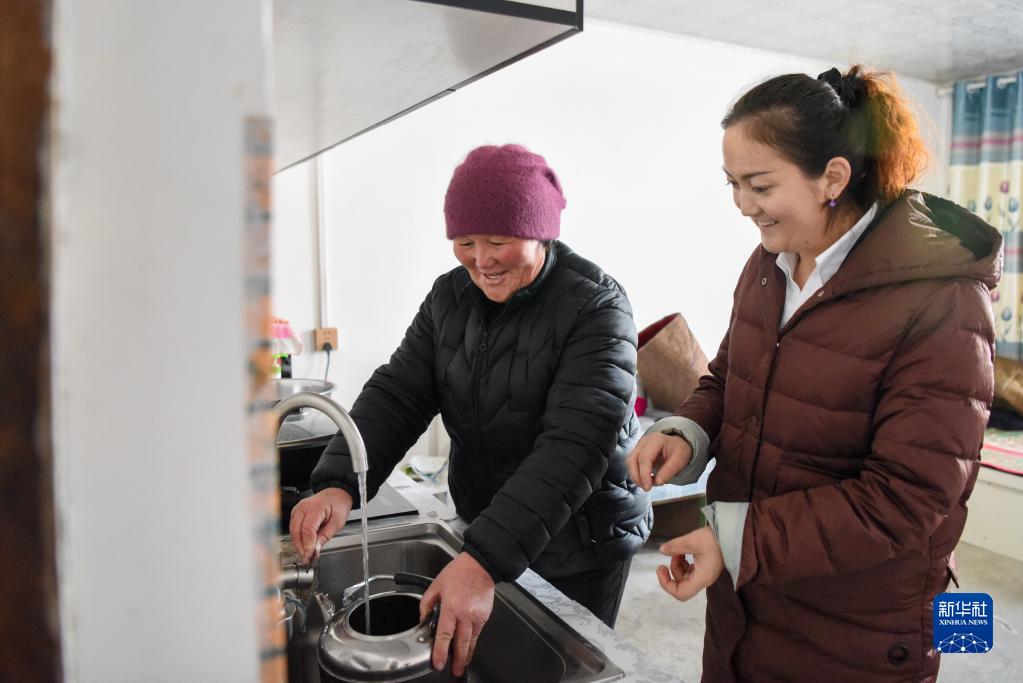 在新疆福??h解特阿熱勒鎮(zhèn)京什開(kāi)薩爾村,村干部(右)來(lái)到前不久剛接通自來(lái)水的村民家中了解水質(zhì)情況(2021年11月25日攝)。新華社記者 丁磊 攝
