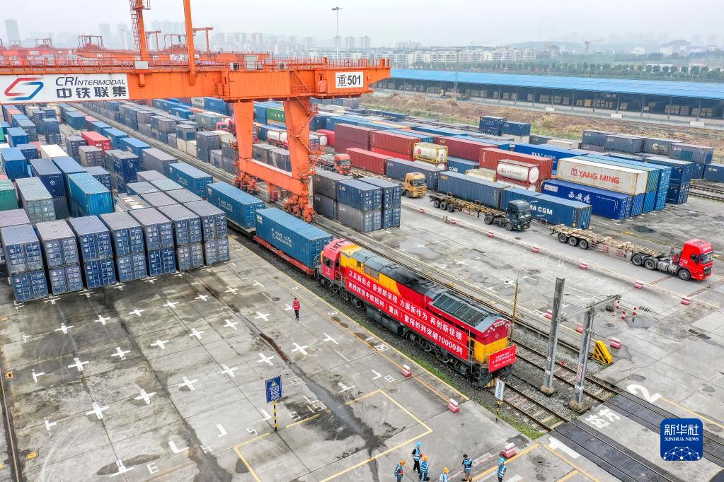 中歐班列(重慶)第10000列列車在重慶團結(jié)村中心站等待發(fā)車(2022年6月23日攝,無人機照片)。新華社記者 黃偉 攝