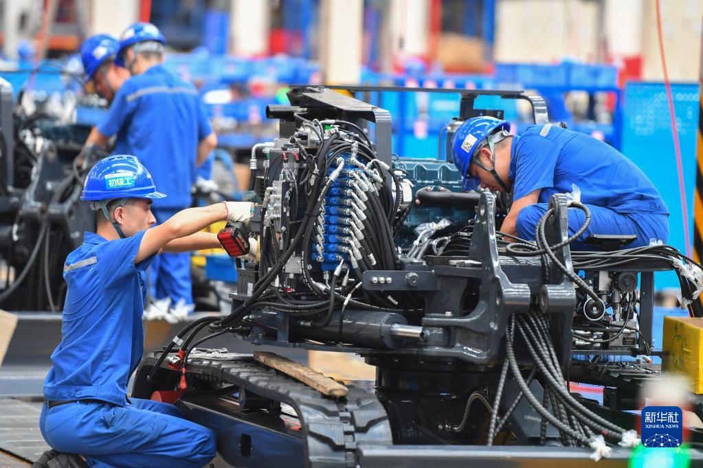 在位于長沙經(jīng)開區(qū)的一家智能裝備公司,工作人員在組裝機(jī)械裝備(2022年7月1日攝)。新華社記者 陳澤國 攝