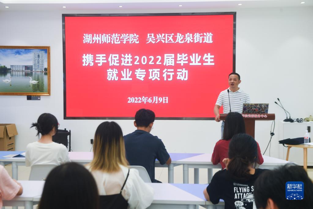 浙江省湖州市吳興區(qū)龍泉街道工作人員應(yīng)邀為湖州師范學院2022屆畢業(yè)生詳細介紹就業(yè)創(chuàng)業(yè)的相關(guān)政策,為畢業(yè)生答疑解惑(2022年6月9日攝)。新華社記者 徐昱 攝