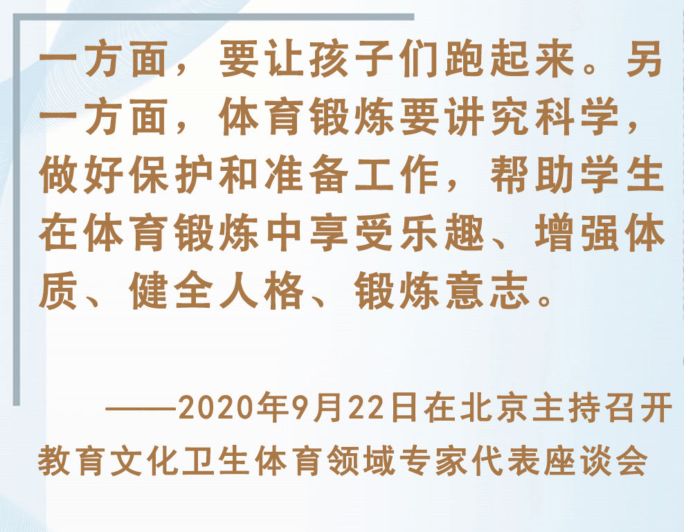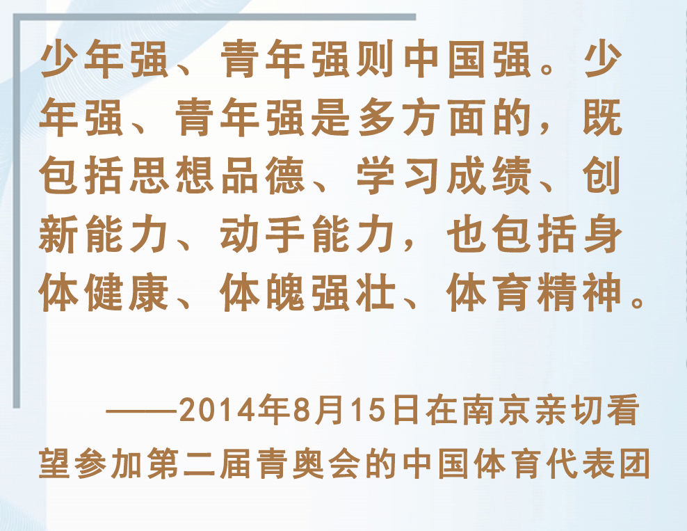 青少年是祖國(guó)的未來(lái)、民族的希望。強(qiáng)健的體魄是青少年成長(zhǎng)成才的重要前提。對(duì)加強(qiáng)體育教育,增強(qiáng)青少年體質(zhì),習(xí)近平總書(shū)記念茲在茲。