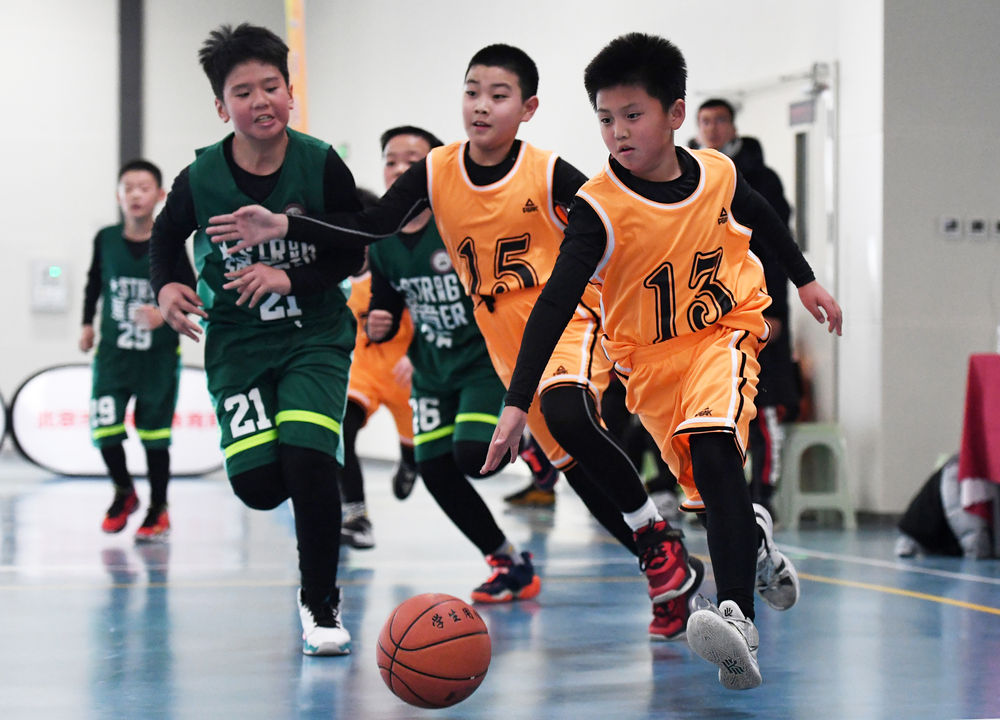 ↑懷柔區(qū)第三小學(xué)選手在2021年北京市第一屆小學(xué)生籃球比賽中帶球進(jìn)攻(2021年12月11日攝)。
