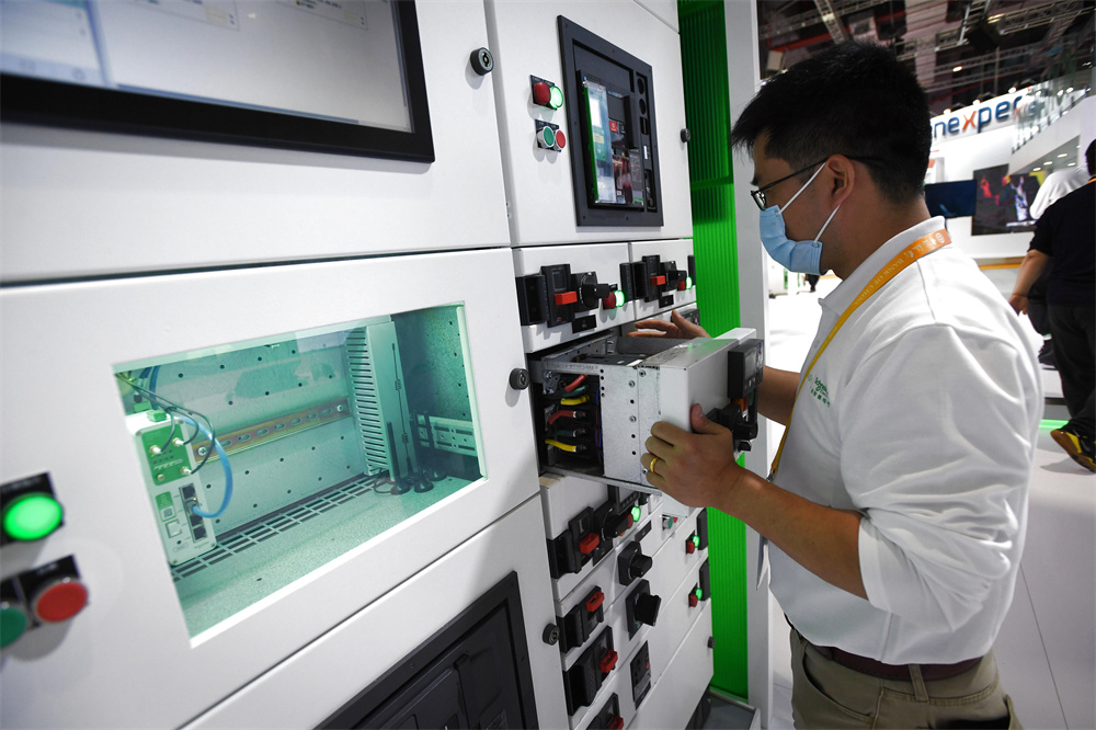 2020年11月5日,在上海舉行的第三屆進(jìn)博會(huì)技術(shù)裝備展區(qū),施耐德電氣展臺(tái)工作人員在操作“Okken新一代預(yù)智低壓成套設(shè)備”。新華社記者 李任滋 攝