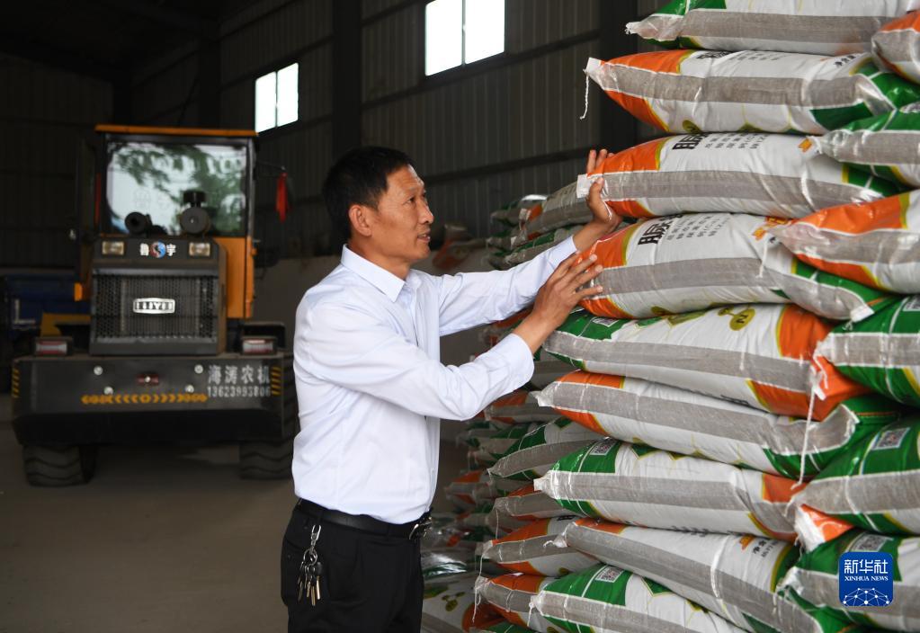 在河南省南陽市唐河縣湖陽鎮(zhèn)張灣村,種糧大戶趙建成在整理倉庫里的化肥,準(zhǔn)備夏收之后的夏種(2022年5月26日攝)。新華社記者 張浩然 攝