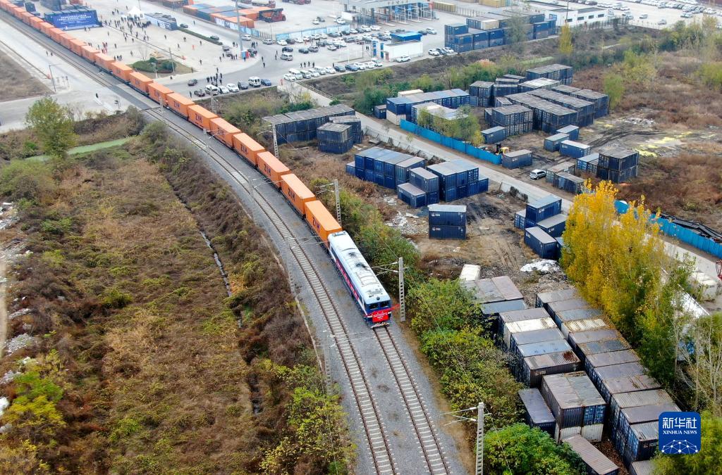中國鄭州至芬蘭赫爾辛基的中歐班列駛出中國鐵路鄭州局集團(tuán)有限公司圃田車站(2020年11月20日,無人機(jī)照片)。新華社記者 郝源 攝