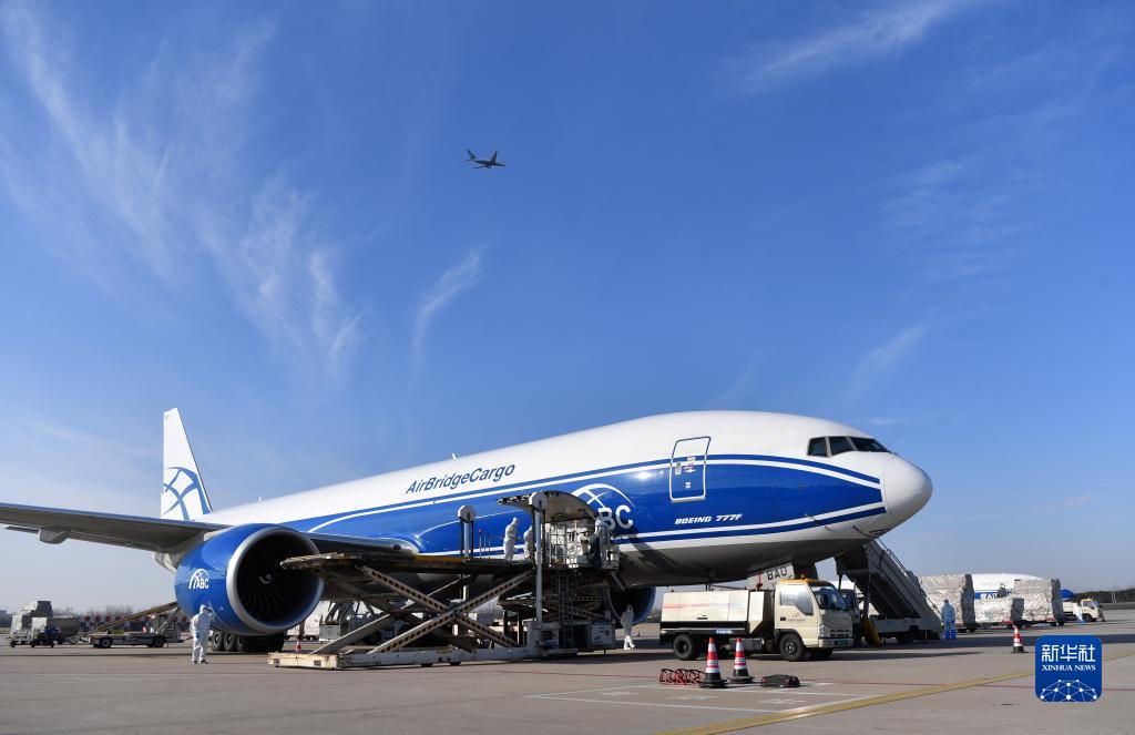 鄭州新鄭國際機(jī)場工作人員在為一架俄羅斯空橋貨運(yùn)航空公司貨機(jī)裝貨(2021年12月30日)。新華社記者 李嘉南 攝