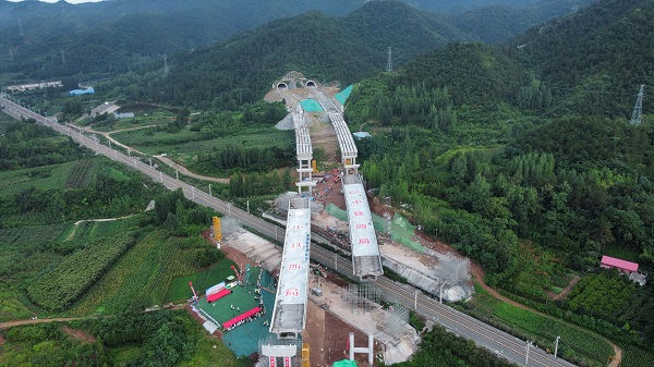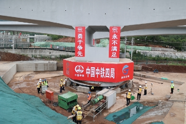 據(jù)悉,由中鐵四局承建的澠淅高速跨浩吉鐵路轉(zhuǎn)體梁全長140米,橋面寬13米,主墩高5米,是澠淅高速的控制性工程之一。該轉(zhuǎn)體梁是國內(nèi)為數(shù)不多的雙幅跨鐵路曲線梁,且距離鐵路線僅有8米,施工難度大,安全隱患多,安全卡控要求嚴(yán)。為實(shí)現(xiàn)精準(zhǔn)對接,項(xiàng)目部分別在2個T構(gòu)主墩安裝千斤頂和液壓泵,同步順時針轉(zhuǎn)體44.5°和42.3°。在歷經(jīng)正常轉(zhuǎn)動、減速轉(zhuǎn)動、點(diǎn)動轉(zhuǎn)動三個階段后,歷時100分鐘精確完成轉(zhuǎn)體。