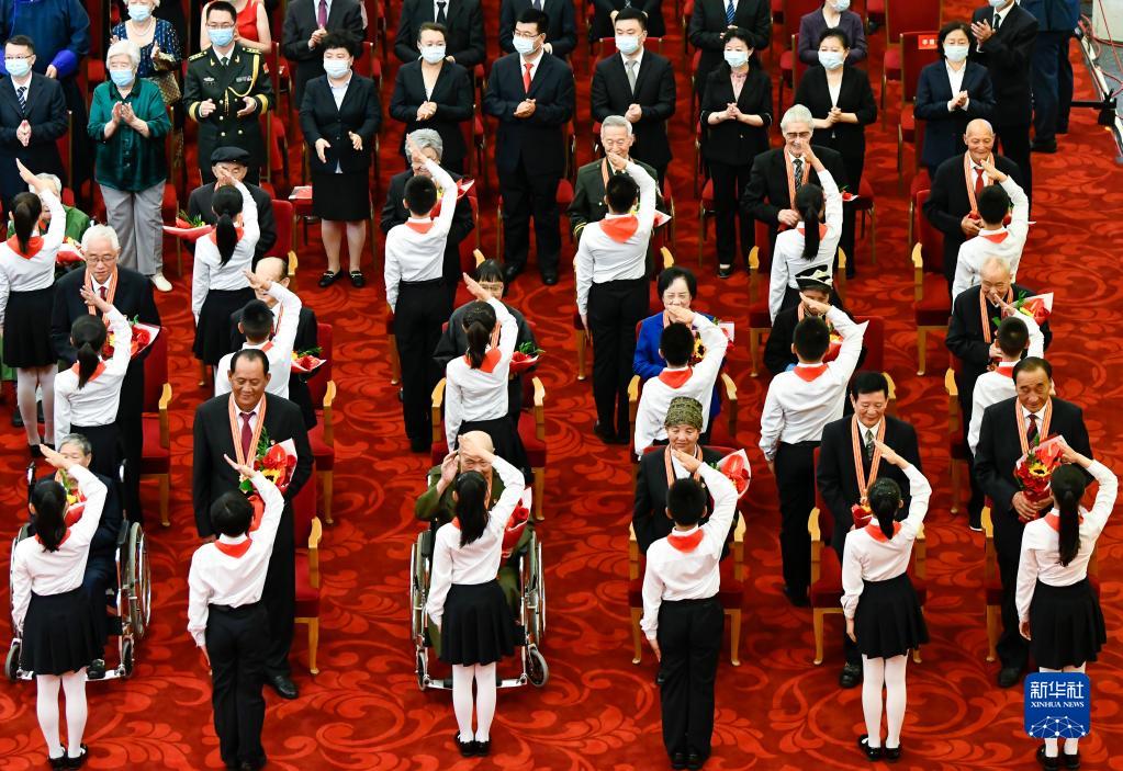 2021年6月29日,慶祝中國共產黨成立100周年“七一勛章”頒授儀式在北京人民大會堂金色大廳隆重舉行。這是少先隊員向勛章獲得者獻花,敬禮致意。新華社記者 高潔 攝