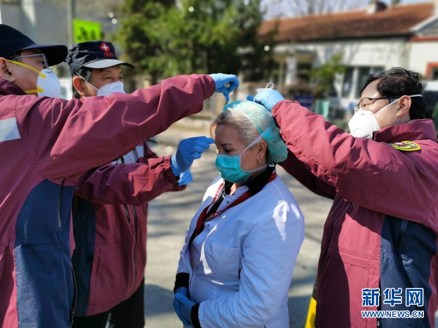 2020年4月4日,中國(guó)赴塞爾維亞抗疫醫(yī)療專家組在貝爾格萊德的基層發(fā)熱門(mén)診為門(mén)診主任特里富諾維奇(中)更換防護(hù)標(biāo)準(zhǔn)更高的口罩。新華社發(fā)