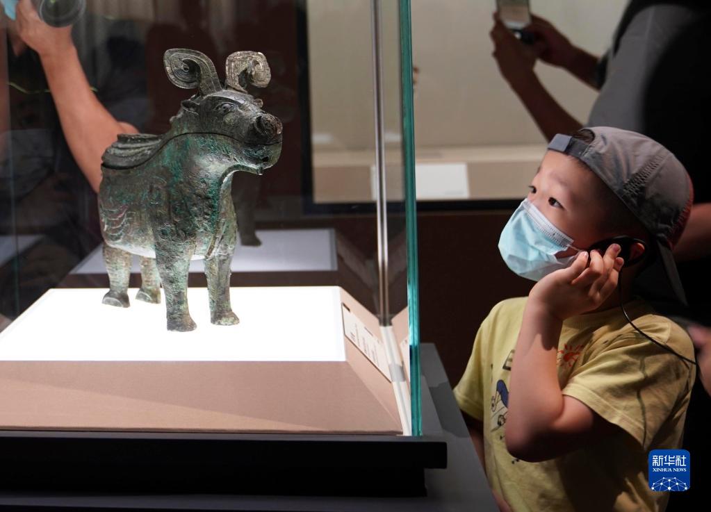 小朋友在上海博物館舉行的“宅茲中國(guó)——河南夏商周三代文明展”上參觀(2022年7月30日攝)。新華社記者 任瓏 攝