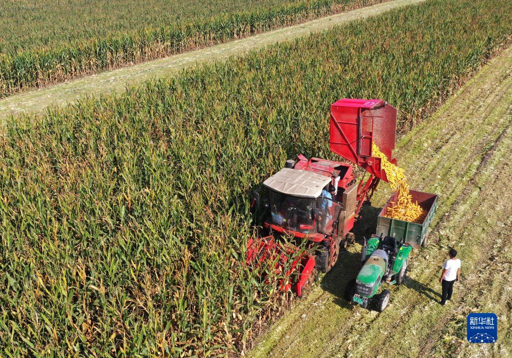 農(nóng)機手駕駛收割機在河南省尉氏縣張市鎮(zhèn)沈家村為村民收獲玉米(9月18日攝,無人機照片)。新華社記者 李嘉南 攝