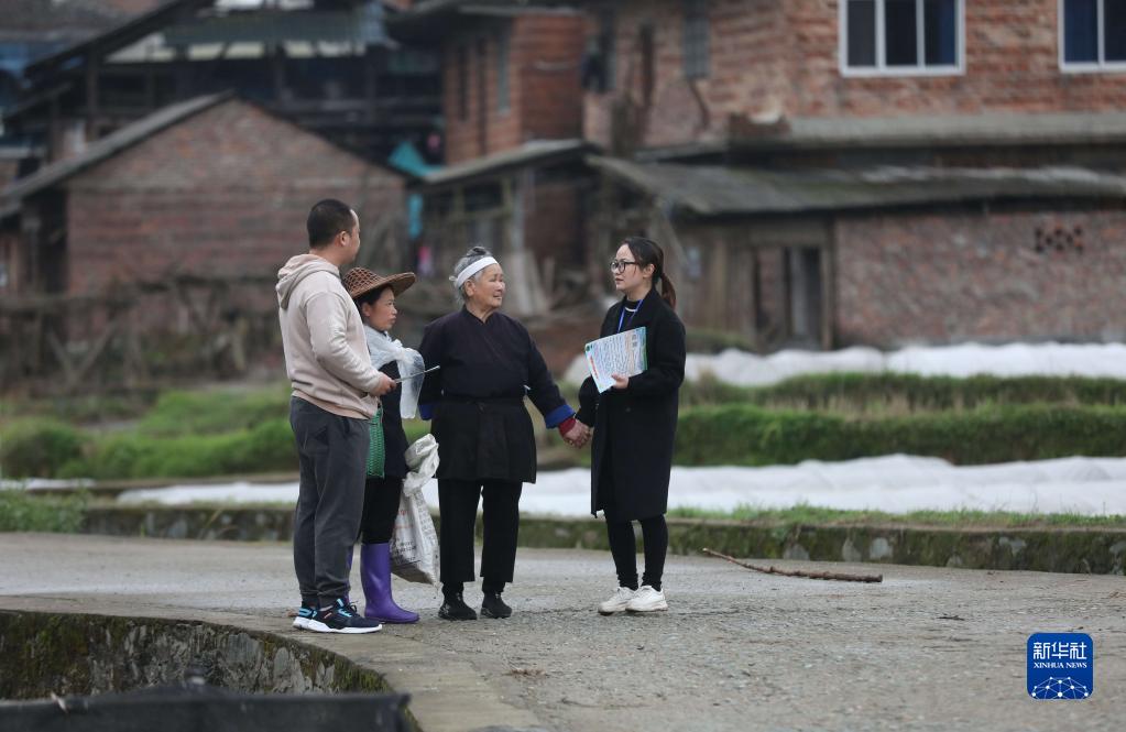 在廣西柳州市三江侗族自治縣良口鄉(xiāng)南寨村,紀(jì)檢監(jiān)察干部(右一、左一)在了解惠農(nóng)政策落實情況(2022年3月24日攝)。新華社記者 黃孝邦 攝