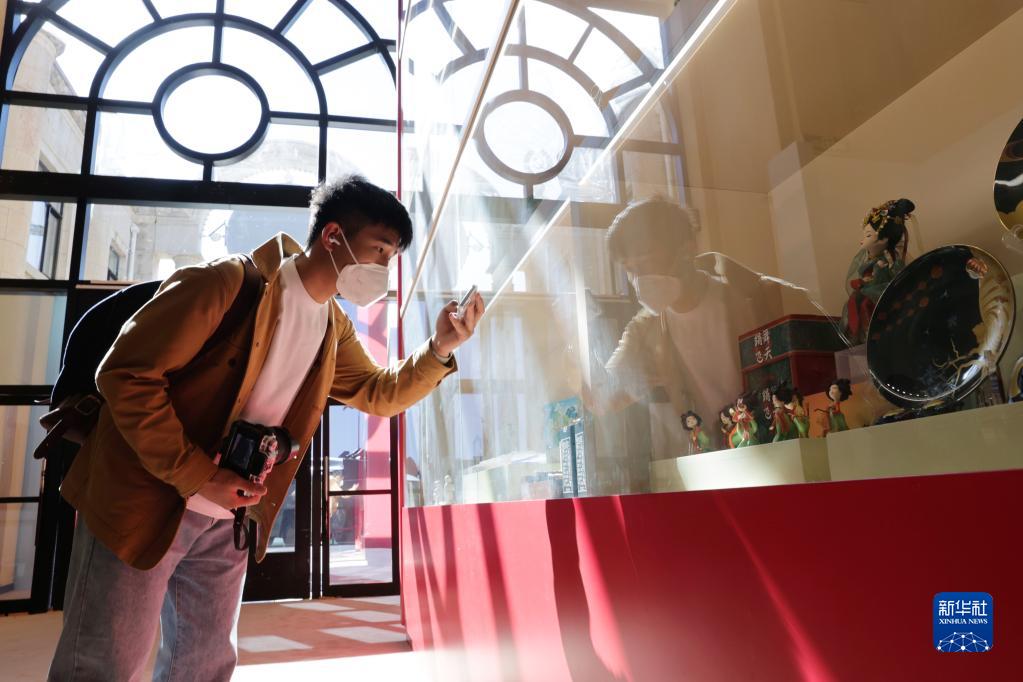 10月10日,觀眾在“奮進(jìn)新時(shí)代”主題成就展第五單元“堅(jiān)定文化自信 建設(shè)社會(huì)主義文化強(qiáng)國”展廳拍攝展示代表性非遺作品和文創(chuàng)精品的博古架。新華社記者 張玉薇 攝