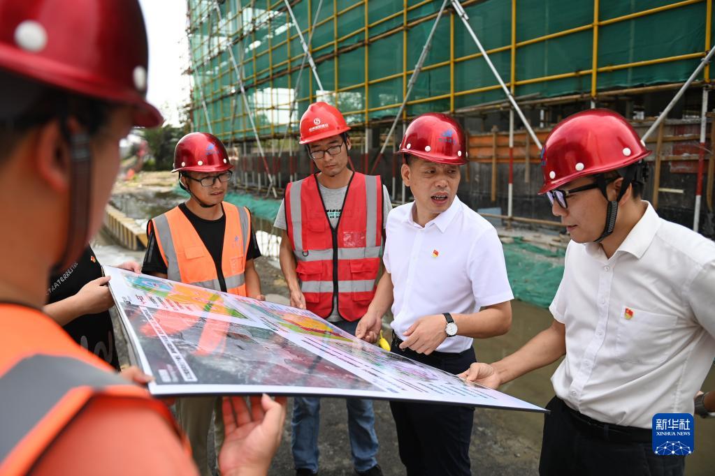 在浙江省寧波市奉化區(qū)蕭王廟街道滕頭村,二十大代表、滕頭村黨委書記、村委會主任傅平均(右二)在村黨群服務(wù)中心大樓建設(shè)工地察看施工進展(2022年9月16日攝)。新華社記者 黃宗治 攝
