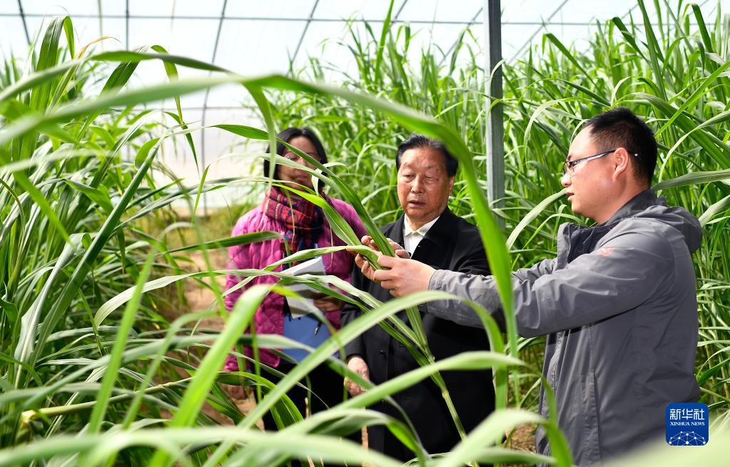 菌草專家林占熺(中)在寧夏銀川市永寧縣閩寧鎮(zhèn)農(nóng)戶劉昌富的大棚里查看菌草生長(zhǎng)情況(2021年3月29日攝)。新華社記者 王鵬 攝