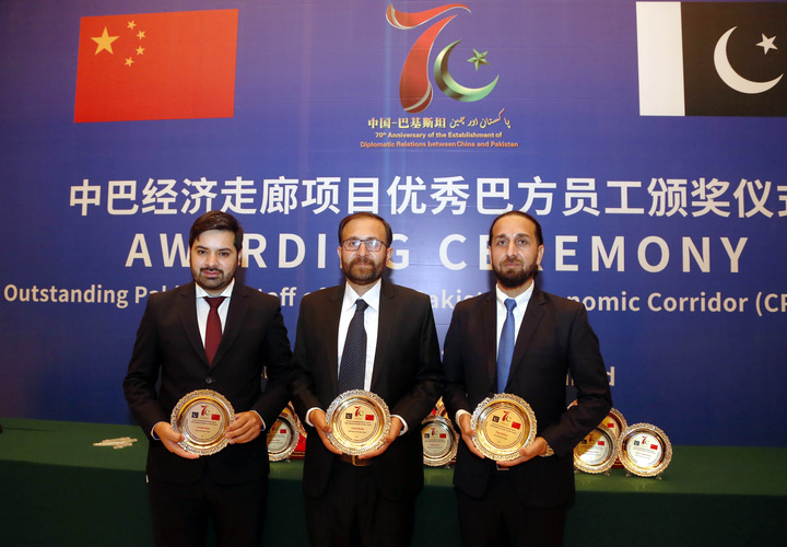2021年12月29日,優(yōu)秀員工代表在巴基斯坦伊斯蘭堡舉行的中巴經(jīng)濟走廊項目優(yōu)秀巴基斯坦員工頒獎儀式上合影。