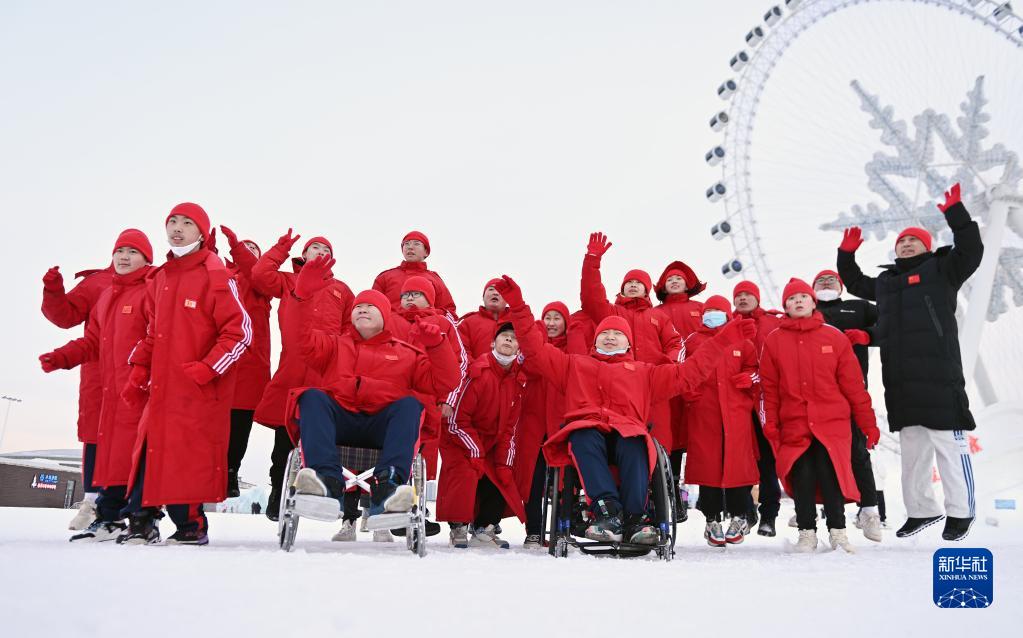 2023年2月9日,黑龍江省殘疾人后備運(yùn)動(dòng)員集訓(xùn)隊(duì)在第七屆中國(guó)殘疾人冰雪運(yùn)動(dòng)季北方主場(chǎng)活動(dòng)現(xiàn)場(chǎng)合影。新華社記者 李賀 攝