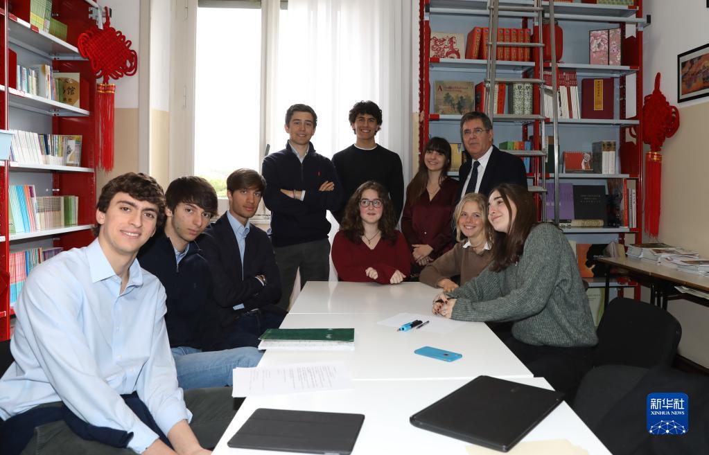 意大利羅馬國立住讀學(xué)校校長雷亞萊(后排右一)與致信習(xí)近平主席的學(xué)生們在一起(2019年3月18日攝)。新華社記者 程婷婷 攝