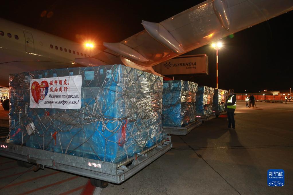 在塞爾維亞首都貝爾格萊德,寫有 “鐵桿朋友,風(fēng)雨同行”字樣的中方捐贈(zèng)醫(yī)療物資從飛機(jī)上卸下(2020年3月21日攝)。新華社記者 石中玉 攝