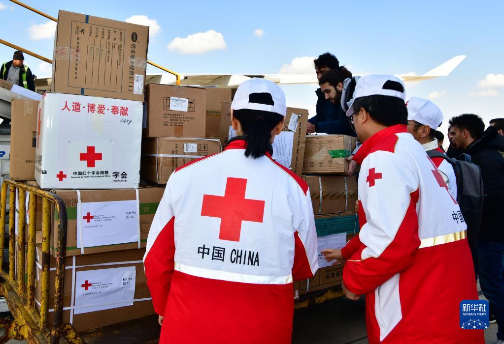 工作人員在敘利亞大馬士革國際機(jī)場卸載中國紅十字會(huì)援助的人道主義物資(2023年2月13日攝)。新華社發(fā)(阿馬爾·薩法爾賈拉尼攝)