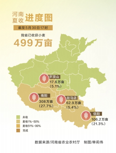 5月30日,天氣晴朗。在確山縣雙河鎮(zhèn)鄧莊村的一塊麥田里,兩臺收割機(jī)正在麥田里穿梭。