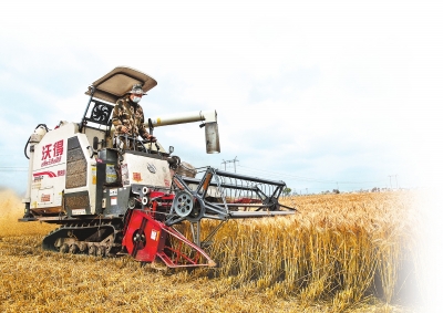 5月30日,鄧州市穰東鎮(zhèn)劉順雨村,農(nóng)機(jī)手操作履帶式聯(lián)合收割機(jī)搶收小麥。 本報記者 王錚 攝