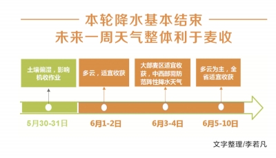 這輪降雨對麥種的品質(zhì)有多大影響?“有影響,但影響不大?!卑拙Ы忉?,為了預(yù)防可能出現(xiàn)的極端天氣,種麥時就平均種了4個品種小麥,其中兩個是正常熟的,兩個是晚熟的。正常熟的大部分在5月28日搶收了,晚熟的6月5日以后才能收割。