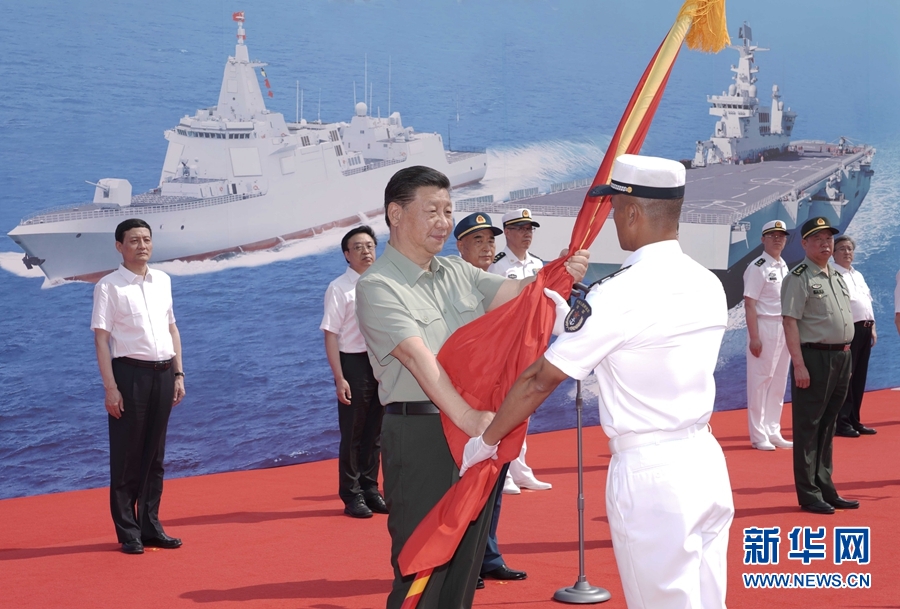 4月23日,海軍三型主戰(zhàn)艦艇——長(zhǎng)征18號(hào)艇、大連艦、海南艦在海南三亞某軍港集中交接入列。中共中央總書(shū)記、國(guó)家主席、中央軍委主席習(xí)近平出席交接入列活動(dòng)并登上艦艇視察。這是習(xí)近平向海南艦授予軍旗、命名證書(shū)。 新華社記者 李剛 攝