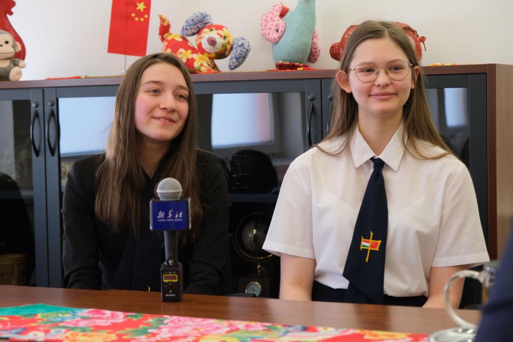2月7日,在匈牙利首都布達佩斯,匈中雙語學校學生胡靈月(左)和宋智孝接受新華社記者采訪。新華社記者 鄧耀敏 攝