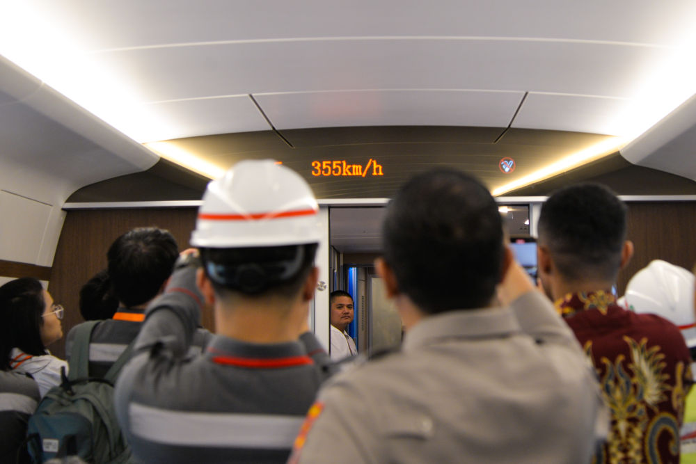 6月22日,印度尼西亞雅萬高鐵聯調聯試綜合檢測列車運行時速首次達到350公里。這是記者和工作人員拍攝顯示列車時速的電子屏。新華社記者 徐欽 攝