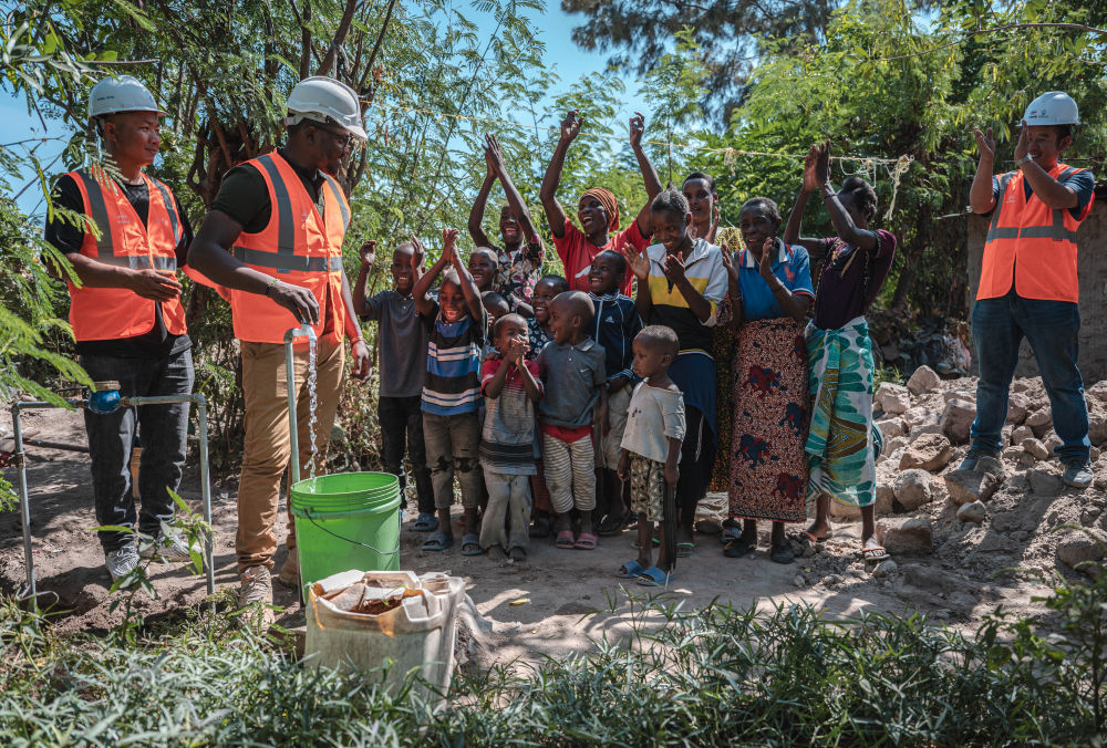 6月13日,在坦桑尼亞姆萬扎省米松圭,中土東非有限公司員工接通水管后贏得當地居民鼓掌歡呼。新華社記者 王冠森 攝