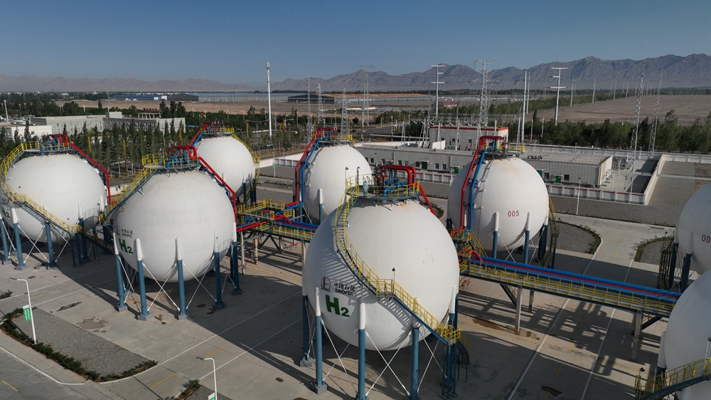 這是2023年6月30日拍攝的中國(guó)石化新疆庫(kù)車(chē)綠氫示范項(xiàng)目制氫廠儲(chǔ)氫罐區(qū)(無(wú)人機(jī)照片)。新華社記者 顧煜 攝