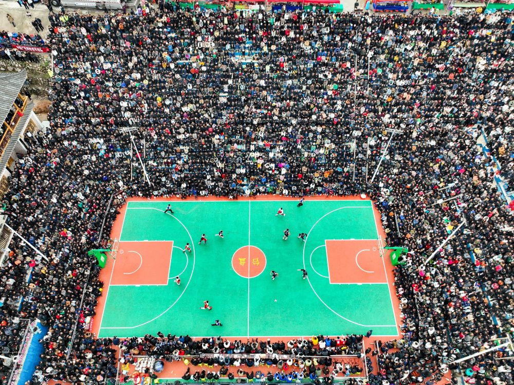這是2023年3月27日在黔東南州臺(tái)江縣臺(tái)盤(pán)村拍攝的貴州省首屆“美麗鄉(xiāng)村”籃球聯(lián)賽總決賽比賽現(xiàn)場(chǎng)(無(wú)人機(jī)照片)。新華社記者 歐東衢 攝