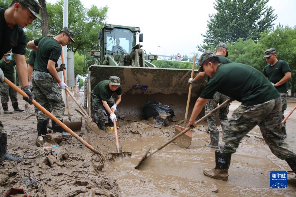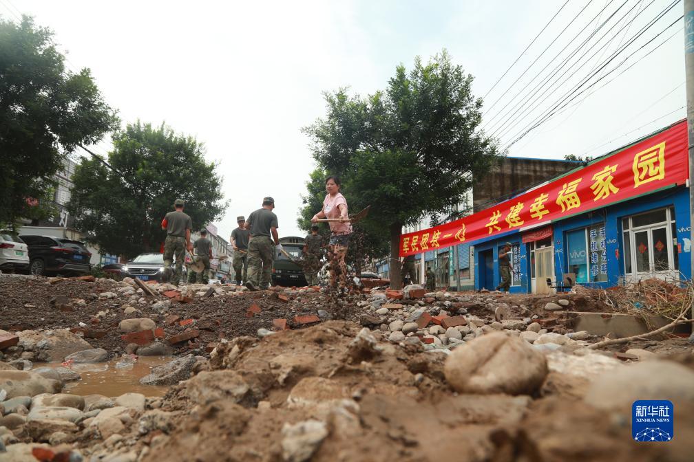 8月7日,武警河北總隊(duì)機(jī)動(dòng)支隊(duì)官兵在涿州朝陽(yáng)大街搬運(yùn)垃圾、清淤清泥、沖洗街道。新華社發(fā) (趙佳亮 攝)