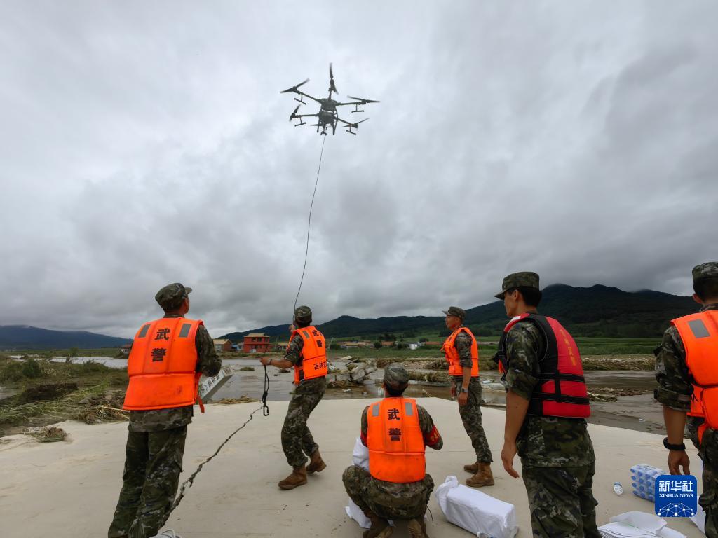武警吉林總隊(duì)吉林支隊(duì)官兵利用無(wú)人機(jī)向舒蘭市開(kāi)原鎮(zhèn)五滴村小鄉(xiāng)屯90余名被洪水圍困的群眾空投食品和飲用水(8月6日攝)。新華社發(fā)(曹孟澤 攝)