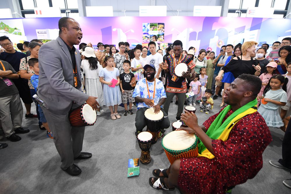 9月2日,在“一帶一路”沿線國家特色文化展示活動上,加納共和國駐華大使館展區(qū)的工作人員在現(xiàn)場即興表演。新華社記者 鞠煥宗 攝