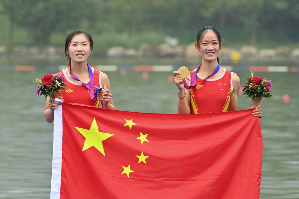 9月24日,鄒佳琪(左)/邱秀萍在頒獎(jiǎng)儀式上。新華社記者 江漢 攝