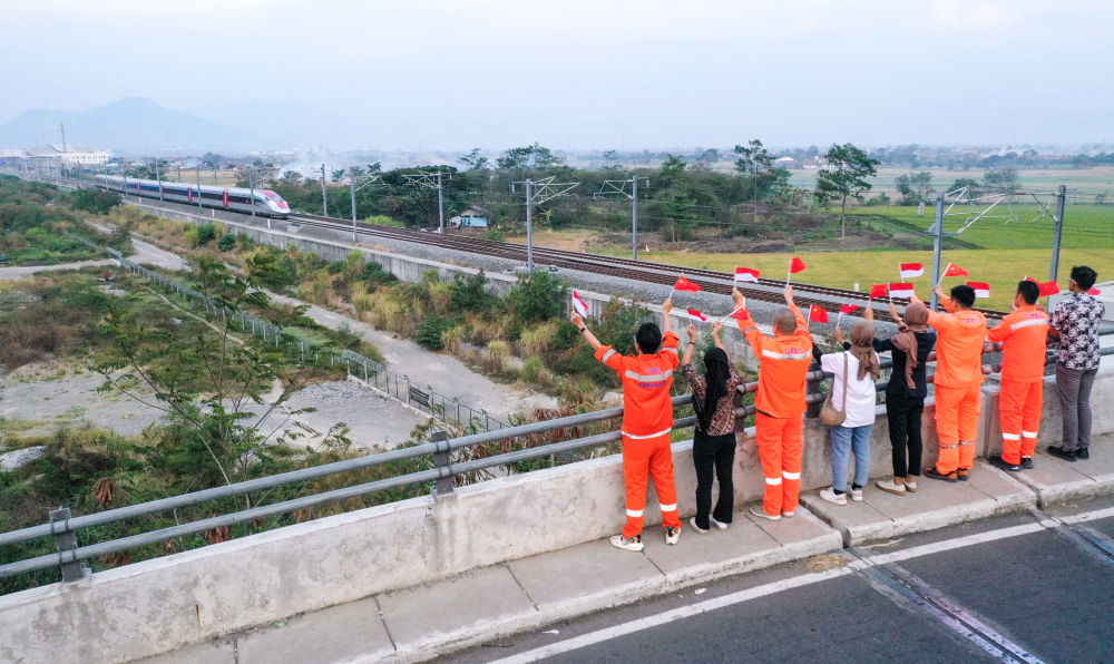 10月17日,在印度尼西亞萬隆一座天橋上,雅萬高鐵建設(shè)單位之一中鐵電氣化局的中國和印尼籍員工揮舞著中國和印尼兩國國旗,向遠處駛來的一列雅萬高鐵高速動車組列車歡呼(無人機照片)。新華社記者 徐欽 攝