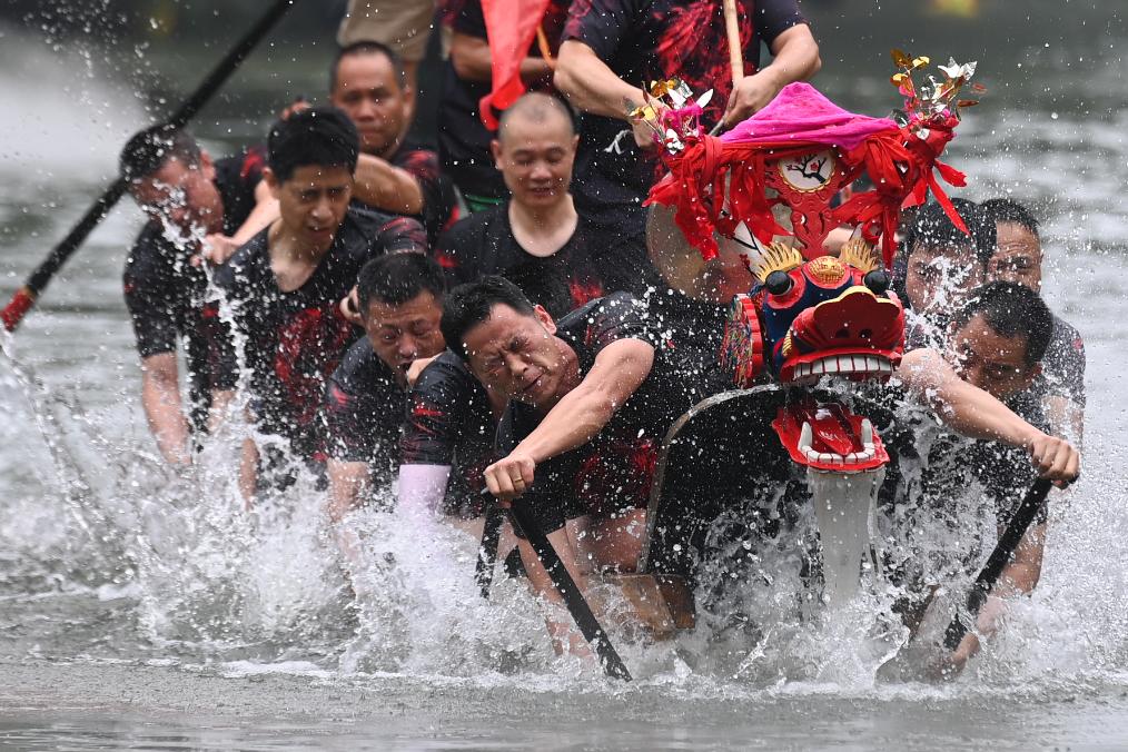 ??2023年6月22日,農(nóng)歷五月初五,中國傳統(tǒng)節(jié)日端午節(jié),村民在杭州西溪國家濕地公園的蔣村龍舟勝會(huì)上劃龍舟。蔣村龍舟勝會(huì)于2011年被列入國家級(jí)非物質(zhì)文化遺產(chǎn)名錄。新華社記者 黃宗治 攝