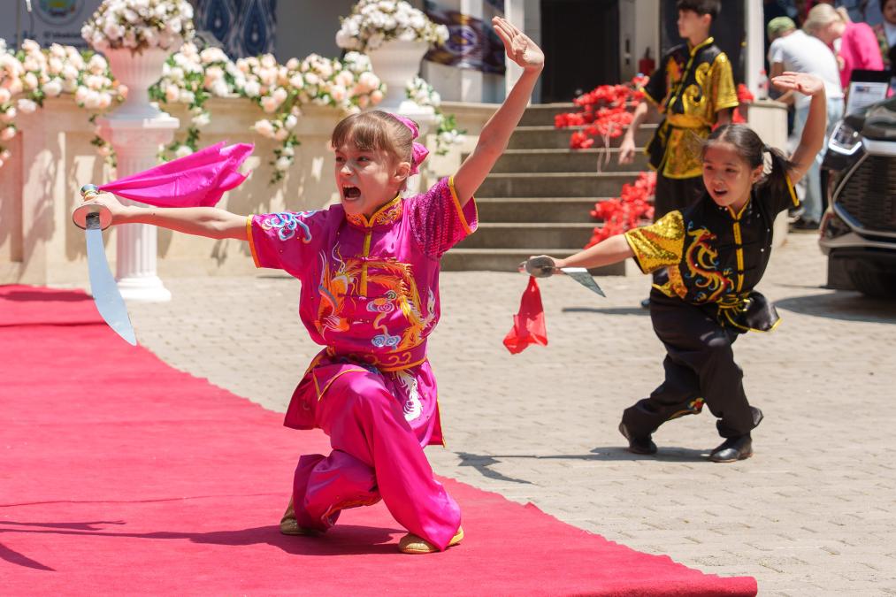 2023年5月27日,小演員在烏茲別克斯坦首都塔什干的中央公園表演武術(shù)。