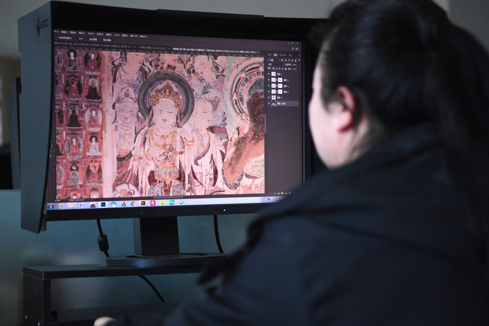 敦煌研究院文物數(shù)字化保護(hù)團(tuán)隊(duì)圖像處理人員年海麗在拼接壁畫圖像(2023年4月25日攝)。新華社記者 陳斌 攝