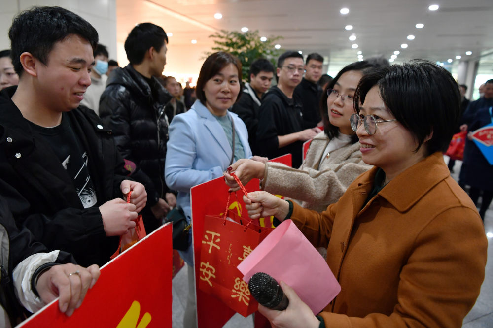 2024年2月15日,福州市人社部門工作人員(前右)向乘坐包機(jī)抵榕的返崗務(wù)工人員送上新春大禮包。當(dāng)日,來自云南、貴州的364名返崗務(wù)工人員乘坐的飛機(jī)降落在福州長樂國際機(jī)場。這是2024年春節(jié)后福州市人社部門通過免費(fèi)包機(jī)接回的首批重點(diǎn)企業(yè)返崗務(wù)工人員。新華社記者 魏培全 攝