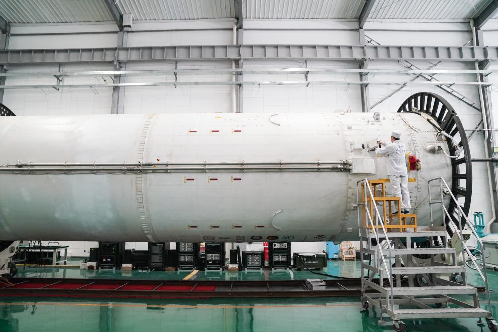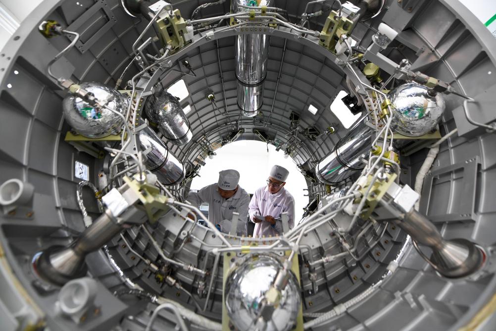 ??北京星際榮耀空間科技股份有限公司裝配測(cè)試人員在安裝液體姿軌控動(dòng)力系統(tǒng)。