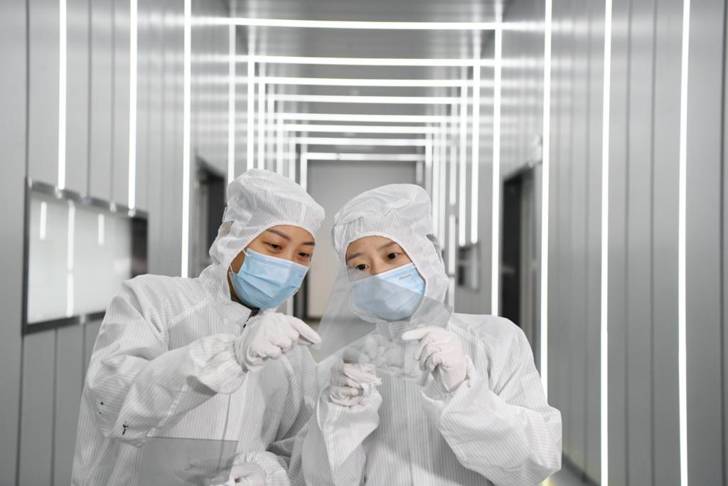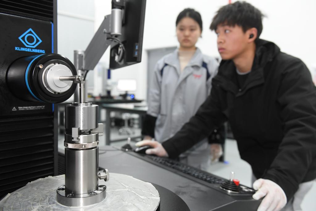 ??在東超科技工廠,技術(shù)人員檢查負(fù)折射平板透鏡原材料的品質(zhì)。