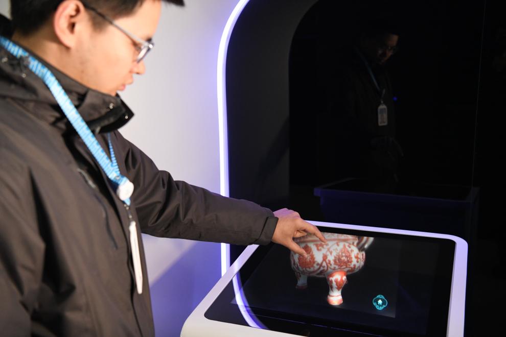 ??在安徽東超科技有限公司,工作人員演示空中成像互動(dòng)查詢(xún)臺(tái)。
