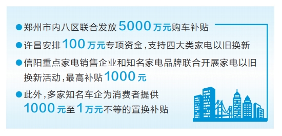 據(jù)了解,鄭州、開封等地及不少企業(yè)均開展了以舊換新促銷補(bǔ)貼活動(dòng)。其中,鄭州市內(nèi)八區(qū)聯(lián)合發(fā)放5000萬元購車補(bǔ)貼;許昌安排100萬元專項(xiàng)資金,支持四大類家電以舊換新;信陽重點(diǎn)家電銷售企業(yè)和知名家電品牌聯(lián)合開展家電以舊換新活動(dòng),最高補(bǔ)貼1000元。此外,多家知名車企為消費(fèi)者提供1000元至1萬元不等的置換補(bǔ)貼。值得關(guān)注的是,此次以舊換新“綠意”十足。各大家電家居企業(yè)聚焦智能智聯(lián)產(chǎn)品推出優(yōu)惠活動(dòng);開封開展家電專項(xiàng)節(jié)能補(bǔ)貼活動(dòng),單件商品可補(bǔ)貼5%至20%。