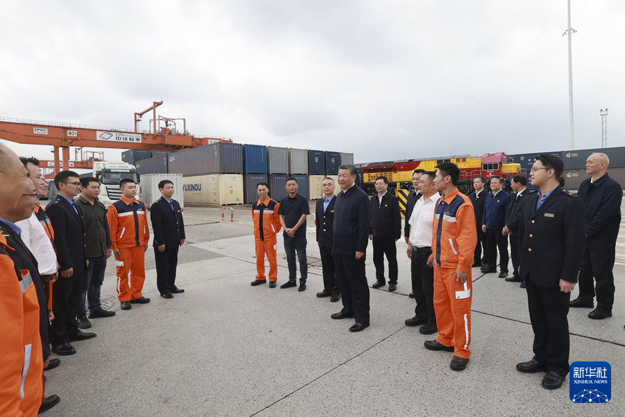 隨后,習(xí)近平來到重慶鐵路集裝箱中心站,聽取貨物集散、運輸路徑、運營成本和效益等介紹,同貨車司機、列車司機、裝卸工人、場站管理人員等親切交流,詢問他們的工作強度、勞動保護、節(jié)假日休息和收入情況。習(xí)近平說,大家在物流一線,也是在對外開放一線,通過你們的辛勤勞動,很多商品跨越山海、走向世界,你們的工作很有意義。推動西部大開放、促進西部大開發(fā),物流很重要,大家要繼續(xù)努力,不斷創(chuàng)造新的業(yè)績,作出新的貢獻(xiàn)。