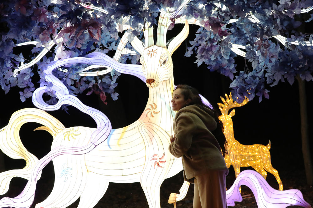 ??2023年12月14日,一名女子在法國巴黎風情園舉辦的“山海有靈”法國豫園燈會上拍照留念。新華社記者 高靜 攝