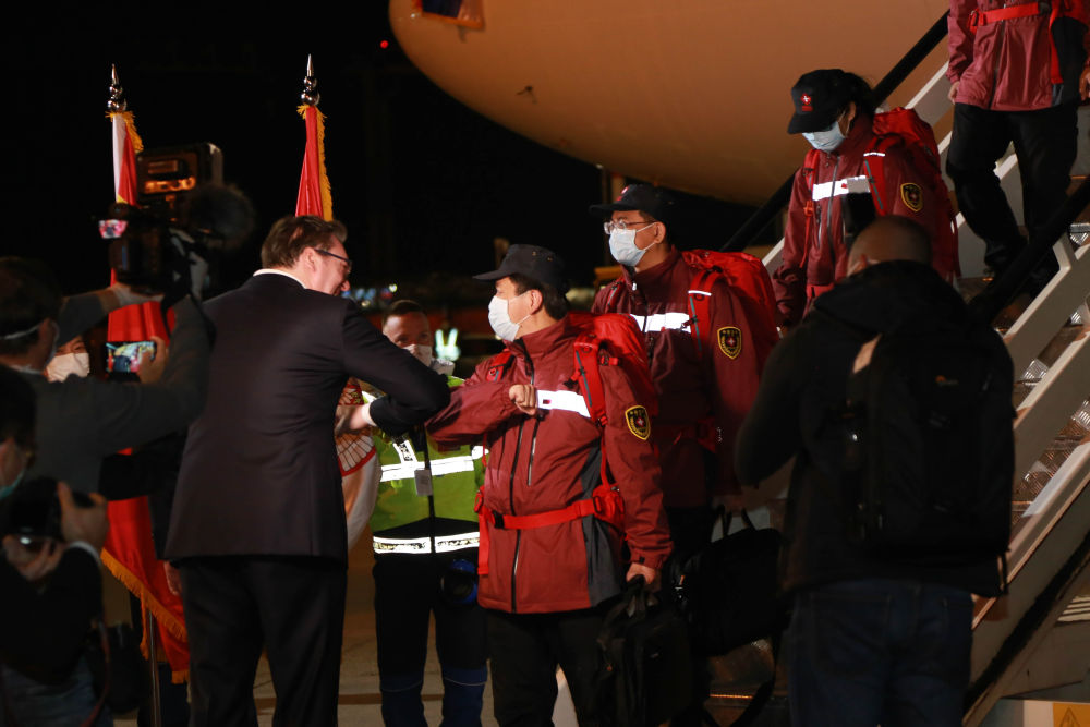 ??這是2020年3月21日,在塞爾維亞首都貝爾格萊德,前來迎接的塞爾維亞總統(tǒng)武契奇(左)與中國援助塞爾維亞抗疫醫(yī)療專家組成員“碰肘”致意。新華社記者 石中玉 攝