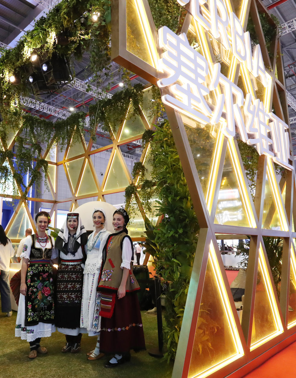 ??2023年11月6日,身著傳統(tǒng)服飾的演職人員在上海進博會國家展塞爾維亞展臺迎接參觀者。第六屆進博會國家展全面恢復線下舉辦,洪都拉斯、塞爾維亞、越南、南非、哈薩克斯坦作為本屆進博會主賓國在國家展亮相。新華社記者 方喆 攝